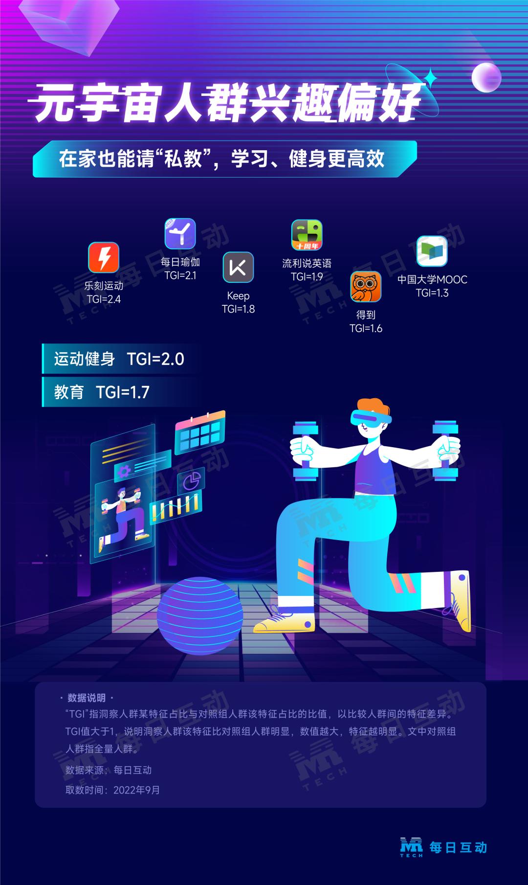 大数据显示,元住民对于“运动健身”和“教育”的偏好度也高于普通人群。不妨畅想一下,当用户穿上装备,登录“乐刻运动”“每日瑜伽”“Keep”等运动类App的元宇宙以后,亲身跟随虚拟教练健身,还能真实感受到教练对于运动姿势的纠正,这可比对着镜子自己练高效多了。元住民对于“流利说英语”“得到”“中国大学MOOC”等学习类App的偏好也比较明显。虽然现在线上授课已经被广泛应用,但是未来要是有了教育元宇宙,用户就可以走进世界名校的教室而不是仅仅跟随视频学习,上课的趣味性和体验感大大提升,学习效率也将变得更高。