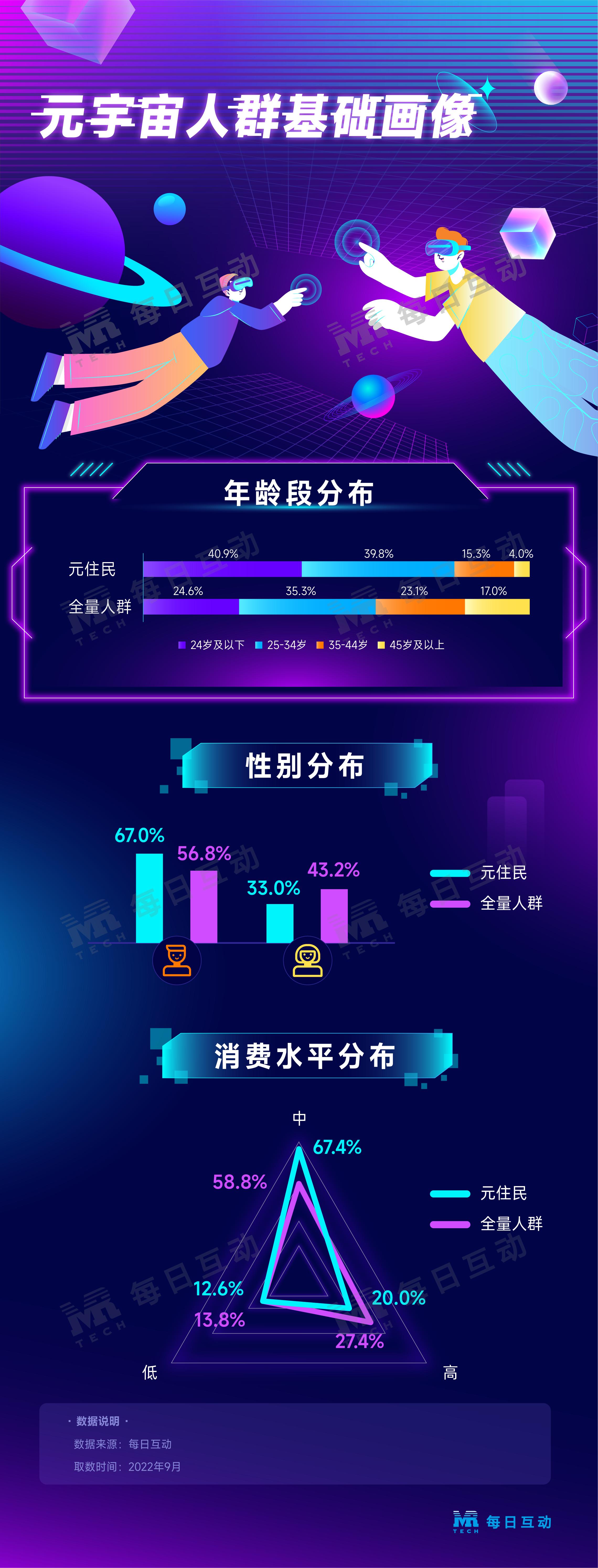 数据智能服务商每日互动大数据对元宇宙的首批元住民进行了深入洞察,希望透过元住民的基础属性特征、线上线下兴趣偏好了解他们的深层次需求,帮助广大企业找到撬动元宇宙市场的支点和杠杆。