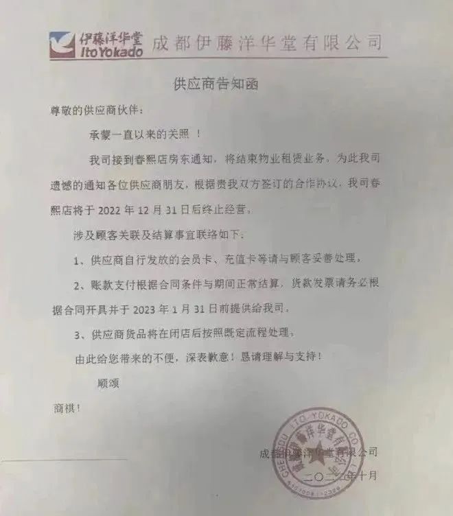 一份盖有成都伊藤洋华堂有限公司公章的《供应商告知函》显示,接业主方通知,将结束物业租赁服务,成都伊藤洋华堂春熙店将于今年12月31日后终止经营。对此,成都伊藤洋华堂方面对《 联商网 》表示,消息属实,与利都广场就续约问题未达成一致。