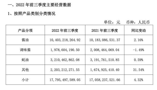 虽然酱油类产品仍然是海天味业第一大支柱,前三季度营业收入达104.03亿元,占比约58.46%,同比微增2.16%。但第三季度营收却同比出现了下滑,期内酱油产品营收约为29.09亿元,去年同期为31.67亿元,同比下滑约8.15%。