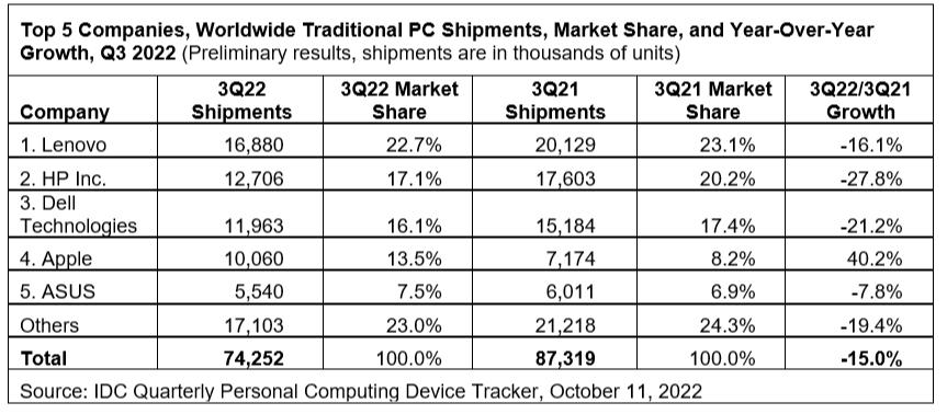 今年,各个行业的发展处境都不太好,大家都进入到寒冬。Strategy Analytics公布的最新数据显示,第三季度全球手机出货量同比下降9%,仅为2.97亿部。其中除了苹果取得6.4%的小幅增长外,三星、小米、OPPO、vivo等几家均出现不同幅度下滑,最高跌幅达到20%。而PC市场的处境就更为惨淡,IDC的统计数据指出,第三季度全球总出货量7420万台,同比下降15%。其中排名第一的联想销量同比下跌16.1%,惠普、戴尔跌幅均超过20%,只有苹果笑到了最后,靠着M系列芯片的强势取得40.2%的增长。