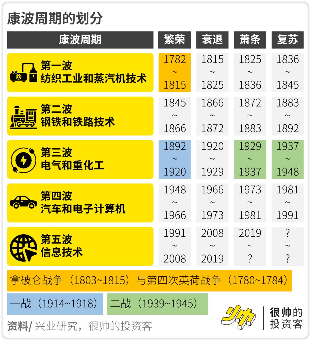 根据历史观察,每50~60年会有一个周期循环,一个循环里一般先有30年左右的上升期(繁荣+衰退),然后有个20年左右的下跌期间(萧条+复苏)。