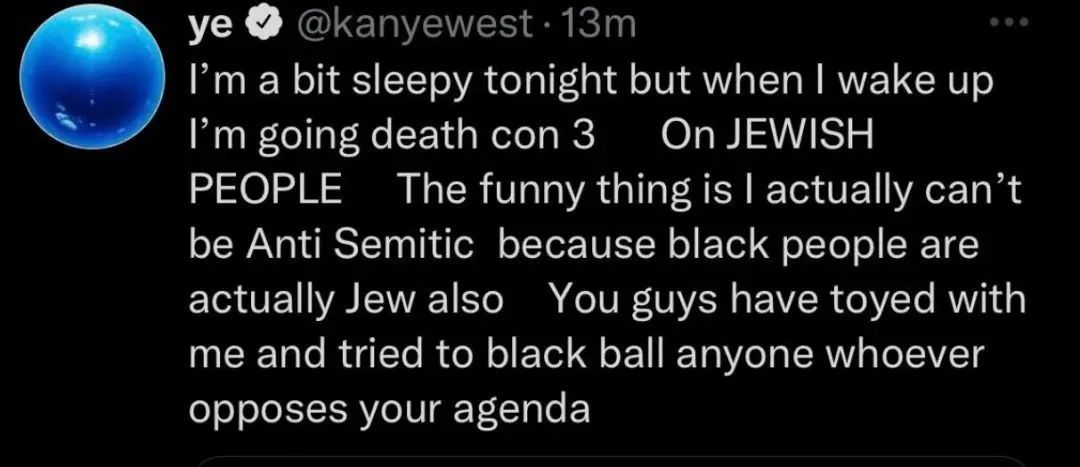 10月9日,一到Twitter他就投下重磅炸弹,直接发表关于反对犹太人的言论,表示自己要进入“死亡戒备等级3”,意指要对犹太人进入战备状态。因为“黑人也是犹太人”,所以他不能成为“反犹太主义者”,但是犹太人一直在“戏耍他”,并“试图禁言所有反对犹太政治议题的人”。