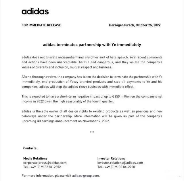 随后,侃爷自认为“统一战线”的Adidas立刻行动,与他终止合作,并公开发表官方声明表示,“Adidas不会容忍反犹主义和任何其他仇恨言论,Kanye West最近的行为违反了公司多元化、包容性、互相尊重和公平的价值观。经过彻底审查,我们决定立即终止合作,停止生产Yeezy产品和其他相关业务,并停止向Kanye West和其单位支付款项,阿迪达斯为现有产品设计权的唯一所有者。”