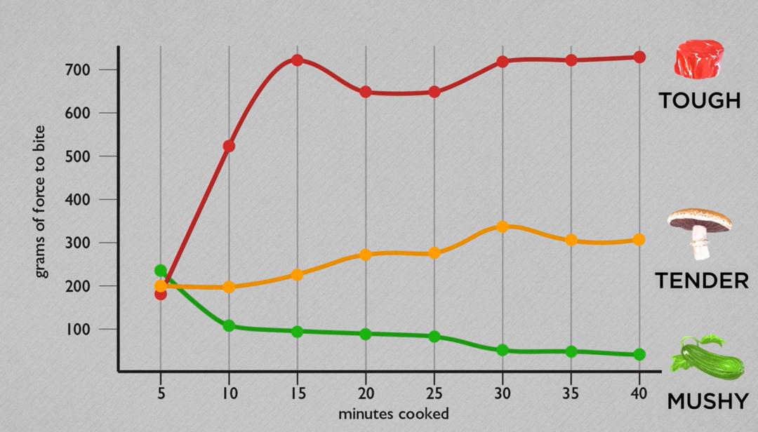 但是,再继续蒸5分钟,一切都变了!这时,咬西葫芦只需要109克的力,相比5分钟前几乎减了半,品尝者觉得它们的口感已经变得太软烂了;牛里脊则相反,咬它需要524克的力,和5分钟前相比翻了将近3倍,品尝者觉得它们吃起来又硬又韧,就像在啃皮革;褐菇则始终如一,咬它需要195克的力,和5分钟前差不多,它的口感也依然嫩滑。