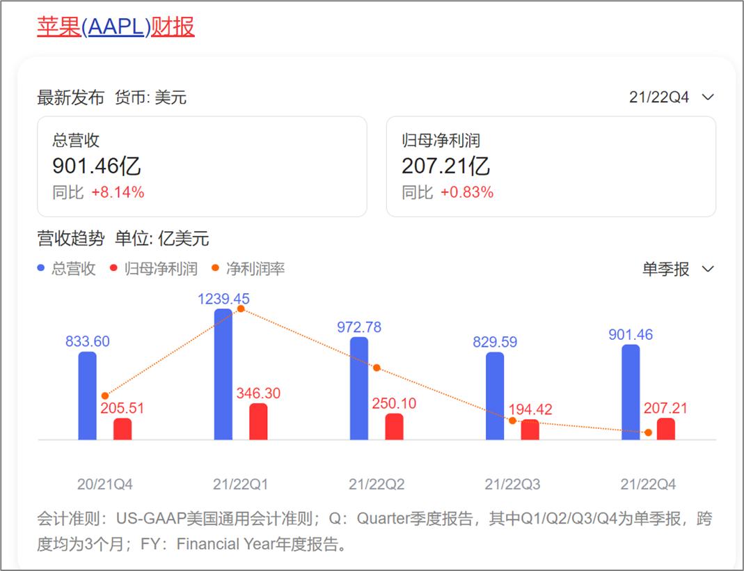 报告显示,苹果在第四财季的总净营收为 901.46 亿美元,和去年同期相比增长了 8.14%;净利润为 207.21 亿美元,相较去年同期增长 0.83%。