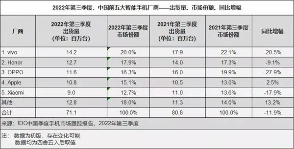 就以 IDC 的数据来说,第三季度在国内市场,vivo、OPPO 的出货量相较于去年同期都下降了 20% 以上,小米也下降了 17.9%;只有荣耀表现稍好,降幅只有 9.1%。