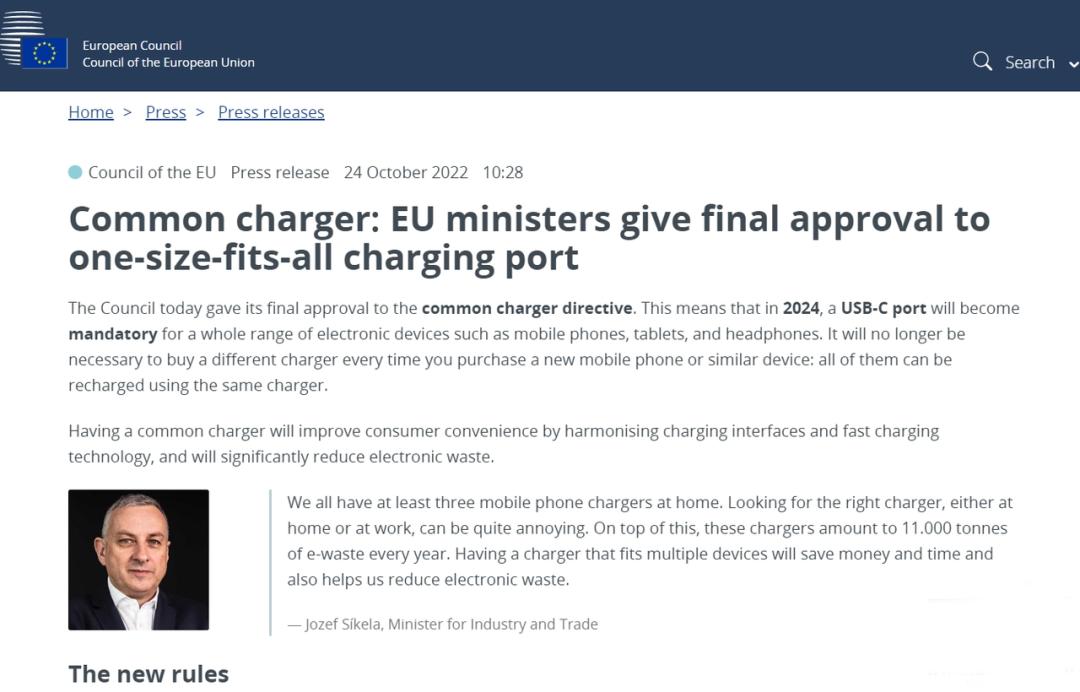 此外,欧盟在 10 月初通过了一项新法规,规定从 2024 年起,智能手机、平板电脑、耳机等便携式智能设备都要统一使用 USB-C 充电接口。