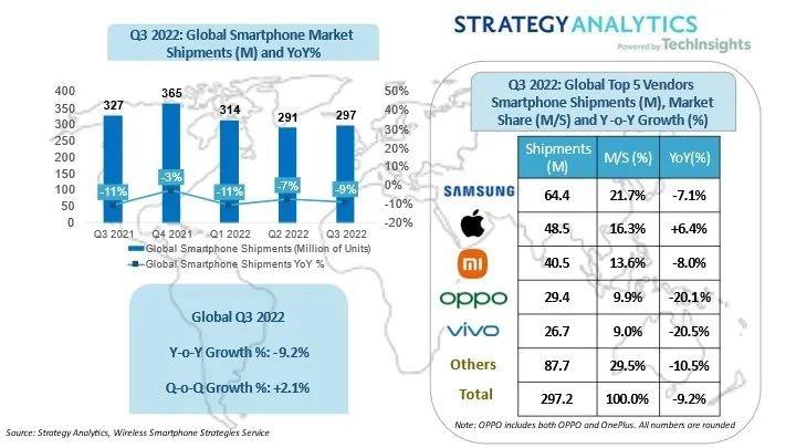 Strategy Analytics 最新的研究数据也提到,第三季度全球智能手机市场销量排名中,苹果以 16.3%的份额排在第二名,仅次于三星(市场份额 21.7%)。