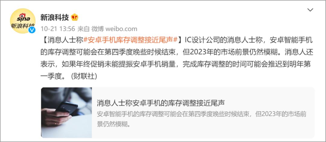 新浪科技: 消息人士称安卓手机的库存调整接近尾声