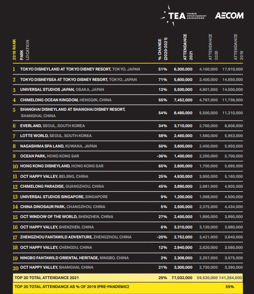 报告显示,亚太地区TOP20主题公园与2020年相比增长29%,但TOP20水上乐园仅增长8%,这主要是因为中国的疫情防控措施比较严格,不仅限制旅行,还要求隔离。其他地区乐园比中国复苏较好,但受中国游客不能出境影响,仍不如北美地区的复苏速度。