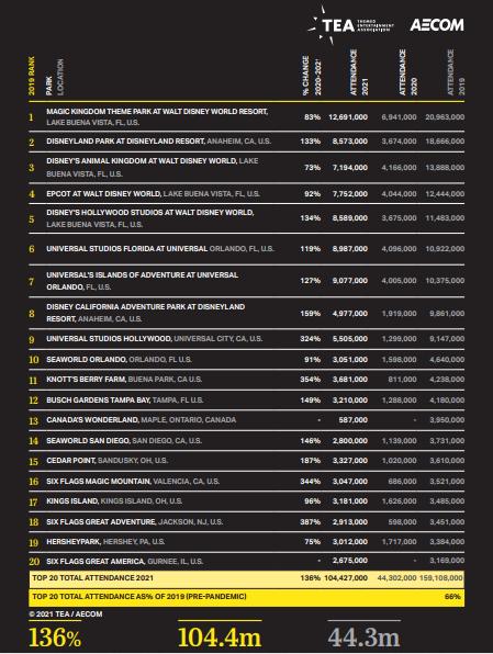 从具体数据上看,2021年,迪士尼乐园游客量850万人次,好莱坞环球影城550万人次,Knott's Berry Farm 360万人次,六旗娱乐魔术山主题公园300万人次,坦帕湾布希花园321万人次,与去年同比增长分别达133%、324%、354%、344%和149%。