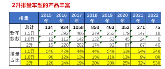 “2.0排量车型是车市黄金排量。”今年年中,乘联会秘书长崔东树表示,2022年新车主要集中于2.0排量,从2020年以来形成较强的高端化趋势,这是市场化的选择。从市场推出的全新车型来看,2017年至今2.0排量新车款款数占比不断走高,到了2022年达到近几年53%的历史峰值。