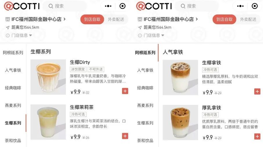 从产品和定价来看,其主打和瑞幸类似的生椰和厚乳系列,打折优惠后目前定价均为9.9(和此前瑞幸的3折补贴类似)。但其晚间还提供酒类饮品,在服务品类上有所拓展。
