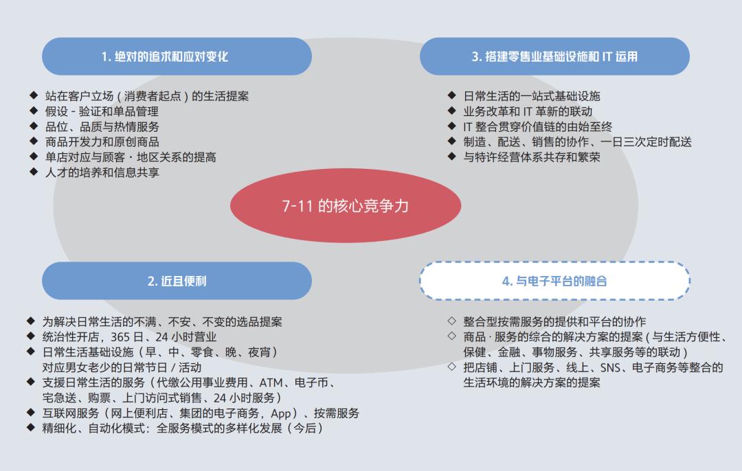 (4)在“与数字化平台的融合”这一方面,7-11做得还不够好,所以用虚线画出来。但是不可否认这是非常重要的零售的新基本功。