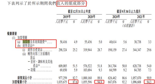 2020年和2021年前9个月,杨国福麻辣烫来自加盟餐厅的收入占比在94%以上,一部分是收取加盟费和系统维护费,这部分的占比在5%左右,另一部分是向加盟餐厅销售货品,这是杨国福营收的主力。