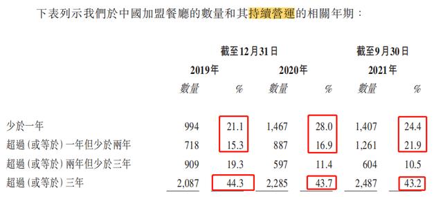 加盟餐厅一边开一边关,营运年期是怎样的?2019年、2020年、2021年前9个月,杨国福麻辣烫超过40%加盟餐厅的营运年期超过或等于3年,不过这个比例在变小,分别是44.3%、43.7%、43.2%。