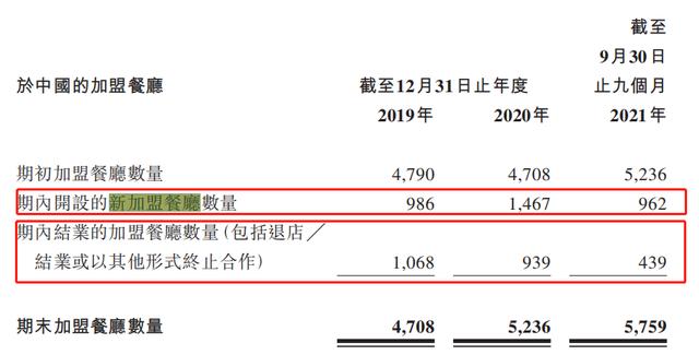 招股书显示,2019年,杨国福麻辣烫国内的加盟餐厅开了986家,关了1068家。2020年开了1467家,关了939家。2021年前3个季度,开了962家,关了439家。