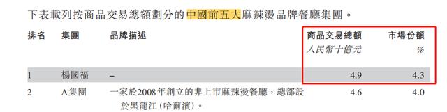 杨国福麻辣烫是麻辣烫界的扛把子,根据此前招股书,2020年的麻辣烫市场,杨国福麻辣烫商品交易额排行第一,金额是49亿元,市场份额4.3%。