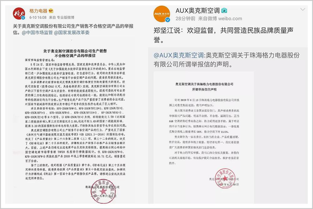 六个月前,格力电器在官方微博上发布了《关于奥克斯空调股份有限公司生产销售不合格空调产品的举报信》,并直接@了国家发展改革委。