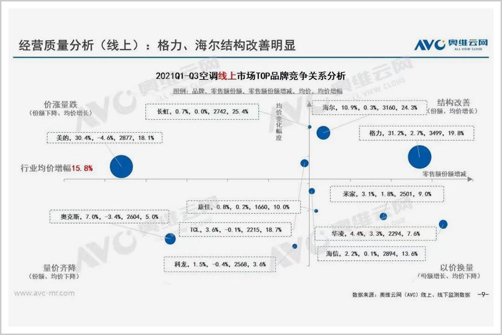奥维云网数据显示,截至今年第三季度,格力空调线上市场份额为31.2%%,美的为30.45.0%,排在第三位是海尔的10.9%,奥克斯已经跌至第四名,为7.0%。