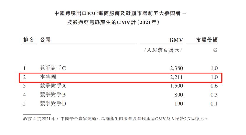按2021年的GMV計,华丙如的子不语集团在“中国跨境出口B2C电商服饰和鞋履的所有平台卖家”中排名第三。如果是仅算在北美的GMV,子不语在中国所有鞋服平台卖家中,排在第一位。(数据源:弗若斯特沙利文报告)