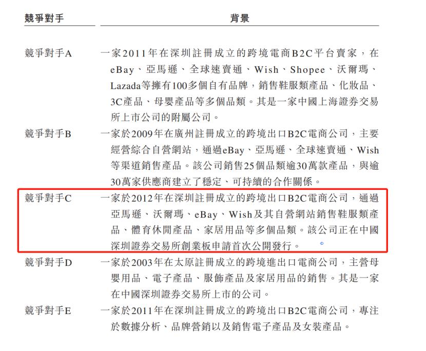 竞争对手C是一家深圳的跨境电商公司,在亚马逊、沃尔玛、eBay、Wish等平台销售鞋服、体育用品和家居产品,目前正在申请深圳证券交易所创业板上市。