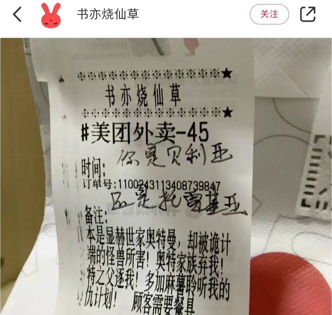 顾客写自己是身世显赫的奥特曼家族,被怪兽所害,要求多加麻薯,店员则在小票上反问:“你是贝利亚,还是托雷基亚奥特曼?