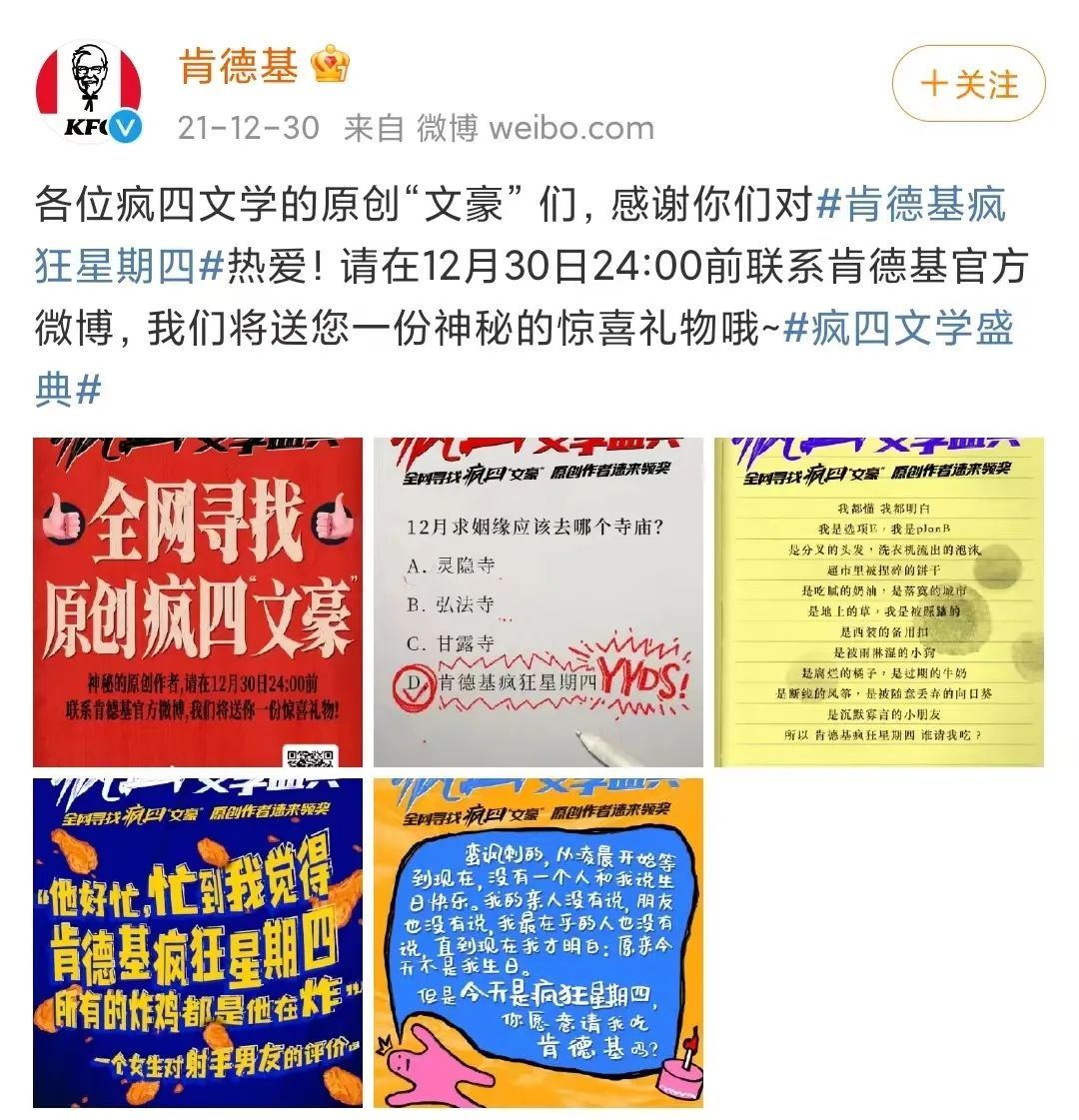 到了2021年12月,肯德基开了一场直播,在直播间举办了一场“疯四文学盛典”,邀请网友们加入共创,官方肯定了网友们的创意。