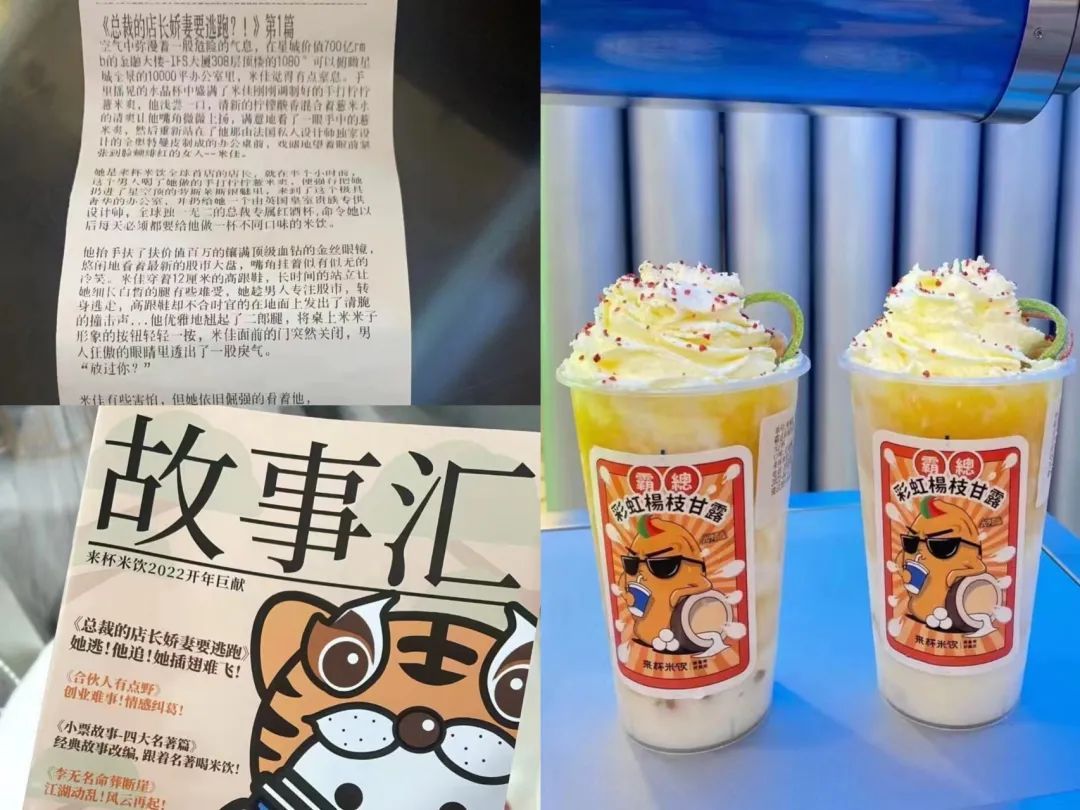 到去年年底时,来杯米饮把半年更新的小说集合起来,做了一本“故事汇”送给粉丝,还根据小票内容开发了一款新品——霸总彩虹杨枝甘露。