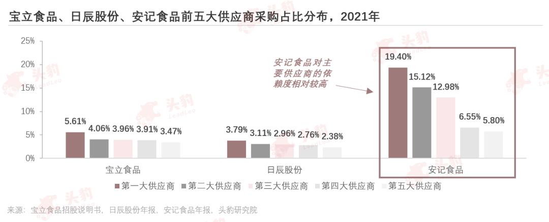 安记食品采购集中度远高于宝立食品与日辰股份,对主要供应商有较高依赖性