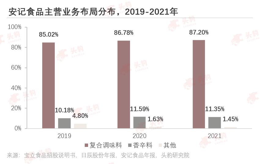 与日辰股份相似,2019-2021年间安记食品主营业务布局结构基本保持一致,复合调味料业务是安记食品的绝对核心业务,2021年该业务占比高达87.2%。除复合调味料业务外,香辛料也是安记食品的主营业务之一,2021年该业务占比达到11.35%。