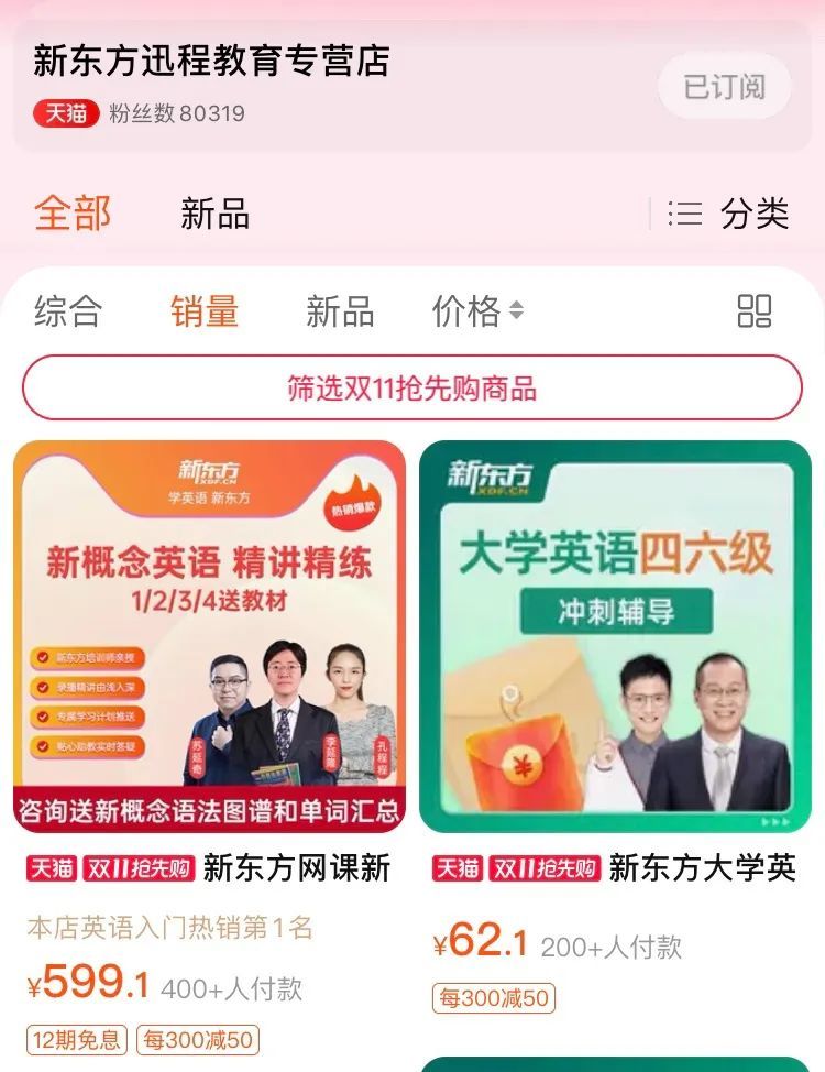 例如,新东方在线的天猫旗舰店“新东方迅程教育专营店”,主要经营成人教育相关产品,涵盖英语、考研、职业证书考试等课程。在俞敏洪这次直播后,截至发稿前,该店铺直播间粉丝约为11.15万,涨粉超过2万。