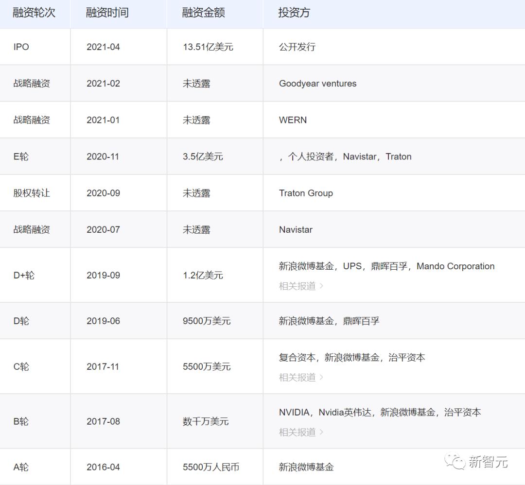 自成立以来,图森未来已完成多轮融资,投资方包括UPS、新浪、英伟达等。