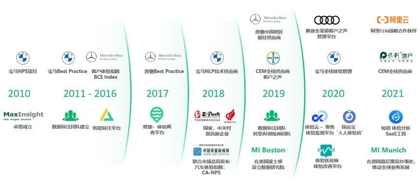 卓思创办于2010年,前6年主要聚焦在汽车行业提供项目制的客户体验调研和咨询服务,在这个过程中,卓思积累了大量的消费者标注数据和业务KnowHow。随着AI技术在应用上的普及,卓思于2016年正式成立研发中心,开始将服务产品化,以谋求更广阔的增长空间。公司将过往积累的数据、方法论与业务KnowHow转化为行业认知图谱,结合AI技术,围绕客户旅程和场景陆续打造了OCEM全渠道客户之声和NICE体验智造两大平台,形成了面向大型企业的PaaS平台+定制化咨询服务的组合解决方案。