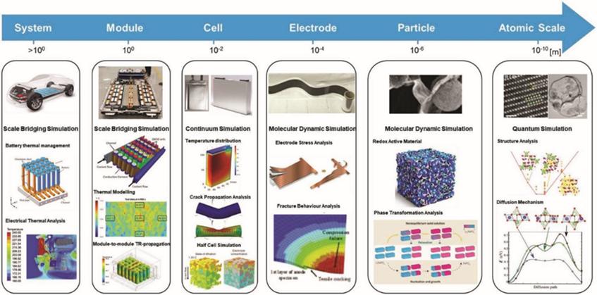当前电池仿真技术主要的发展趋势为多尺度仿真。多尺度仿真即跨越微宏观多个尺度,在电池材料本征特性(微观原子、分子层面)、活性材料颗粒、极片、电芯以及电池模组、电池包多个尺度上进行仿真模拟和设计优化。