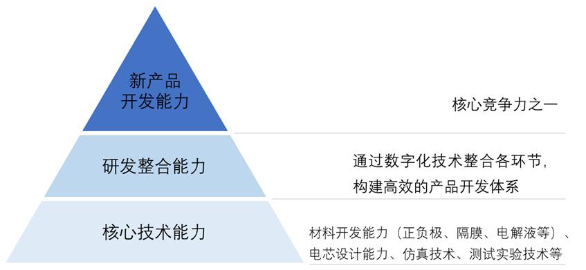 新产品开发主要依托企业的核心技术能力进行,因此图中新产品开发能力金字塔的底层是各类核心技术能力,在电池行业领域,包括电芯设计能力、包含正负极、隔膜、电解液等材料在内的材料开发能力、电化学仿真能力、材料计算能力、测试实验能力、生产工艺能力(包括烧结包覆)等等。