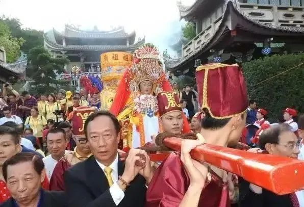 郭台铭是妈祖的忠实信徒,经常去寺庙毕恭毕敬地点上几柱香。2017年,福建湄洲的妈祖“金身”赴台巡游,67岁的郭台铭还全程抬轿护驾。