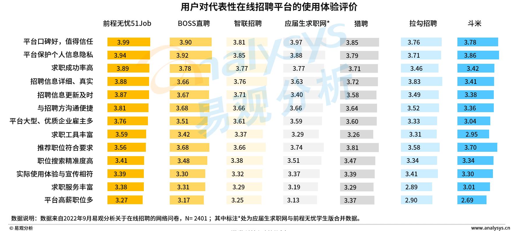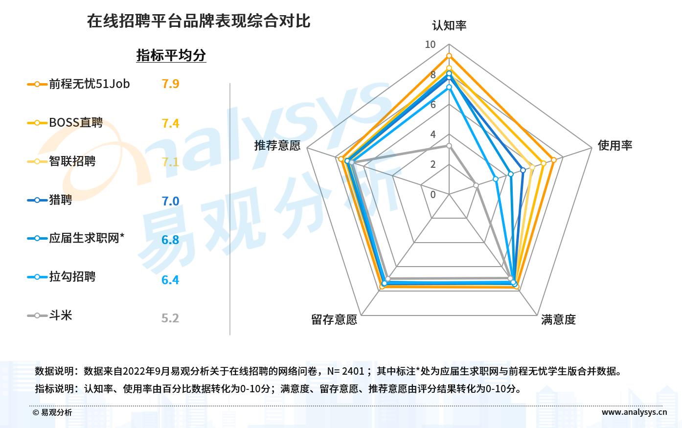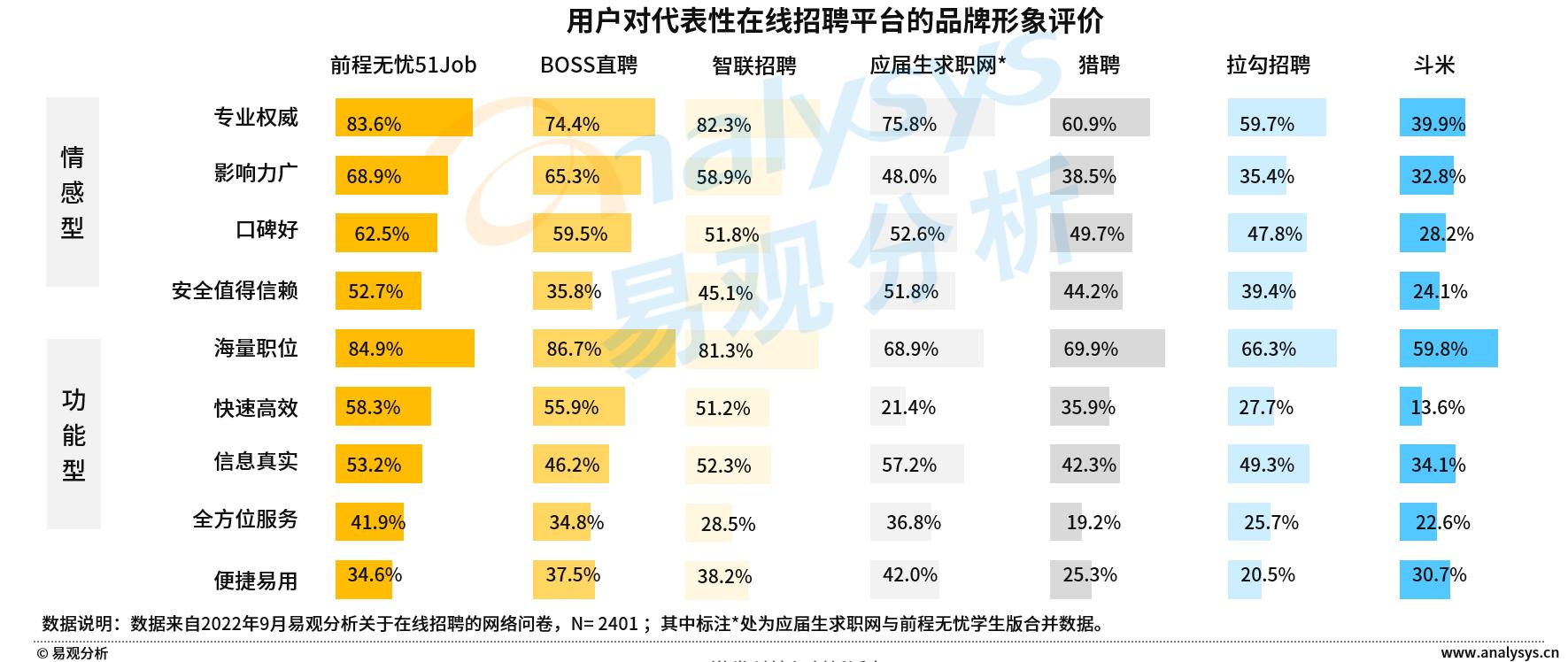 前程无忧51Job依托全方位发展战略,在职位数量、专业权威性、影响力、口碑等多维度形象方面获得了高认可度;专注学生用户的应届生求职网及前程无忧51Job学生版则在平台安全性、信息真实性、产品易用性方面具备形象优势。