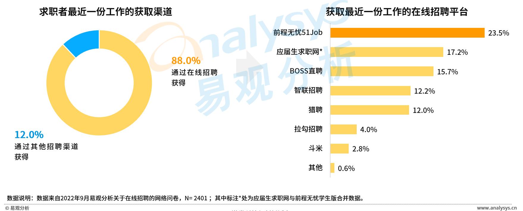 调研显示,有88%的求职者通过在线招聘获得最近一份工作。其中,前程无忧51Job、应届生求职网、BOSS直聘分别占比23.5%、17.2%、15.7%。