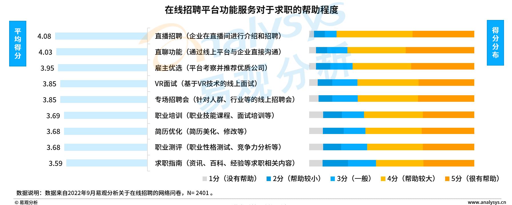 其中,直播、直聊、VR面试等功能助力双方线上直接沟通,提高求职效率,是受访者认为最有助于求职的功能类型;此外,雇主优选、专场招聘会提升求职保障性和便捷度,也是求职者认为有较大作用的服务。