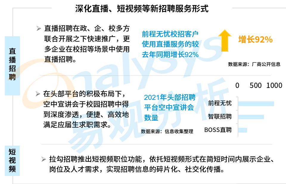 “直播+”、“短视频+”等创新招聘服务形式日趋丰富,通过与在线招聘多个环节、场景的融合满足后疫情时代下的用户新需求。