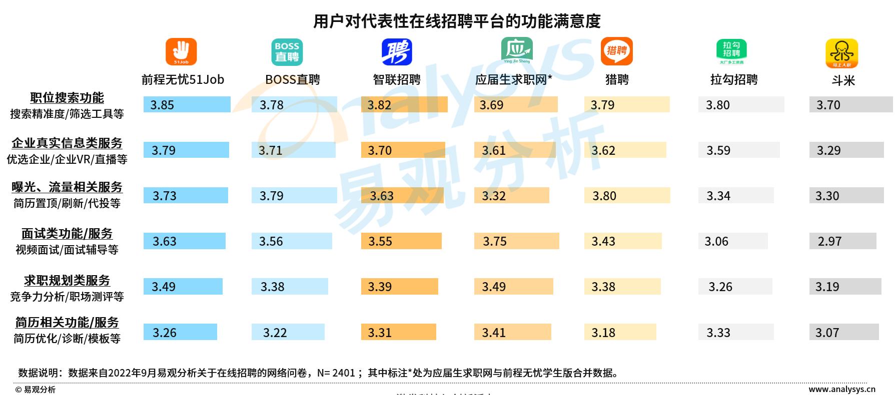 其中,前程无忧51Job在职位搜索、企业真实信息类服务、面试类功能/服务等多方面获得较高满意度;应届生求职网则在面试类功能/服务上具有相对突出的表现。