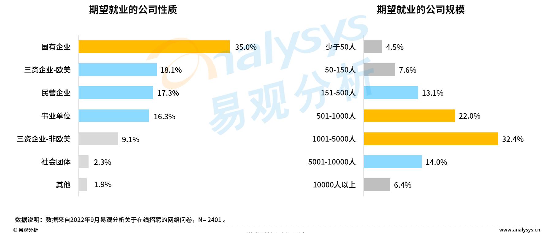调研结果显示,35%的求职者期望入职国有企业,看好国企在稳定性、福利待遇等方面的优势;其次,欧美三资企业、民营企业、事业单位也较受欢迎。从公司规模来看,超七成求职者更偏好就职于500员工以上的大、中型公司,就业保障相对更高、公司发展更全面。