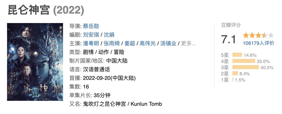 腾讯视频本月重点独播剧是《昆仑神宫》,实际上,在“多季排播”的点上,腾讯视频对鬼吹灯的IP开发算是走得比较早、也实际趟出了一条路。相比上一作《云南虫谷》,本作迎来了口碑回归,10万+的豆瓣打分人数,也足以说明这个系列在“类型剧”层面的成功,《昆仑神宫》拿下了10月猫眼全网热度榜的3个日冠,表现不俗。