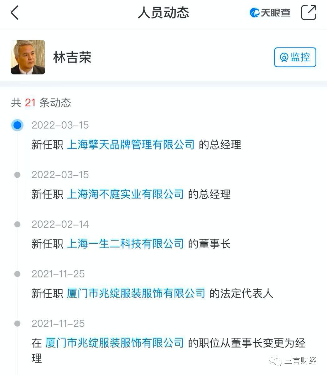 今年以来,林瑞阳新任职了上海一生二科技有限公司的董事长、上海淘不庭实业有限公司的总经理、上海擘天品牌管理有限公司的总经理。