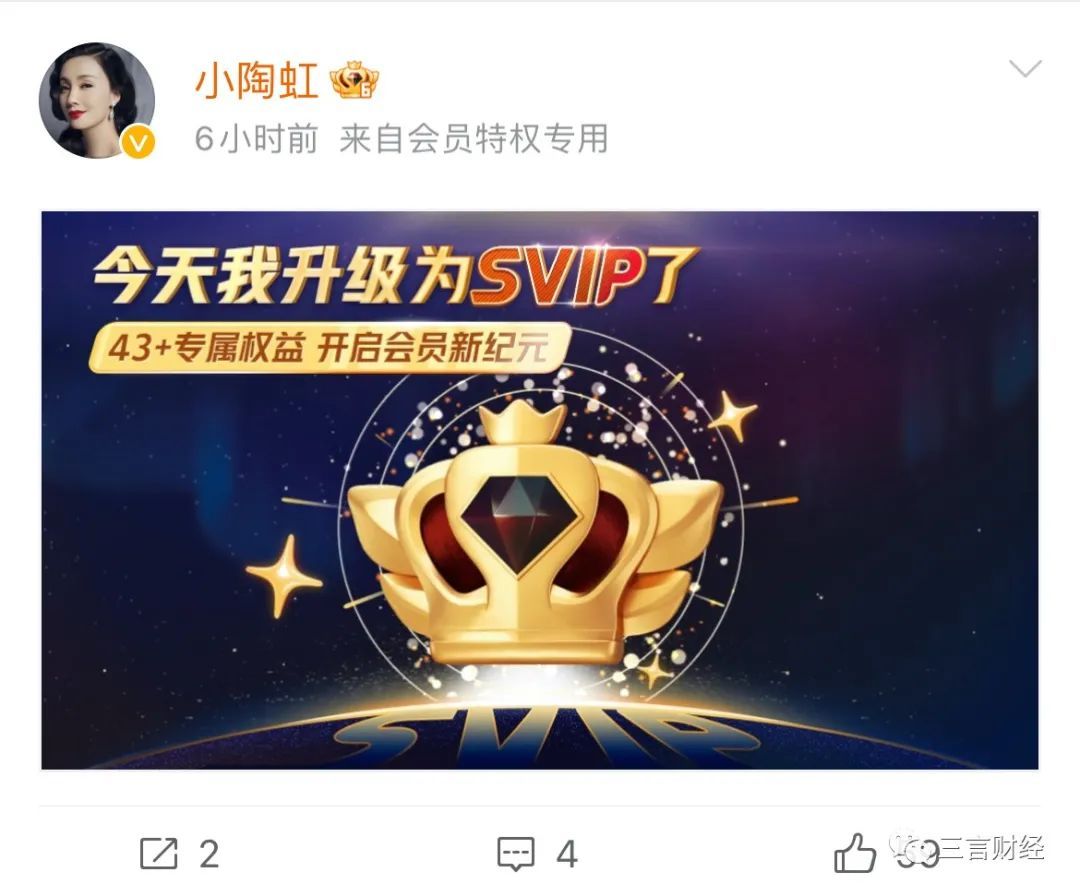 而陶虹的微博,今天下午发布了一条其成为微博SVIP的动态。