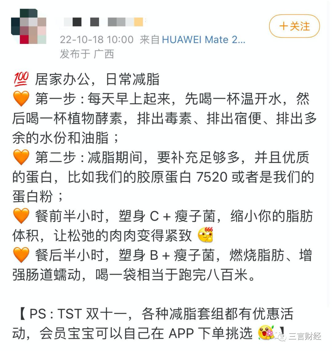 10月18日,一位网友发文称,TST双十一各种减脂套组都有优惠活动。
