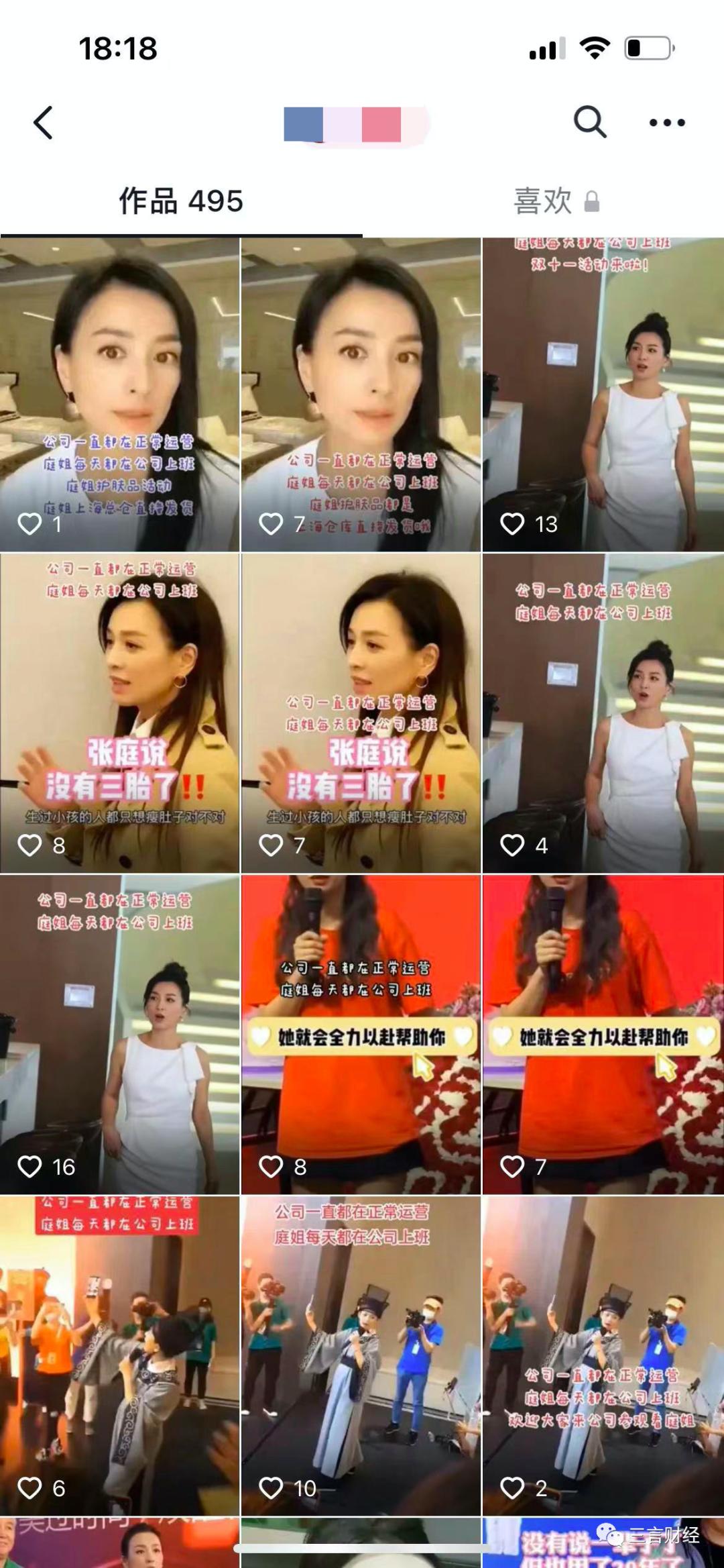 下图中这个账号近期发布了多条视频,并在视频中配文:“公司一直都在正常运营,庭姐每天都在公司上班”。