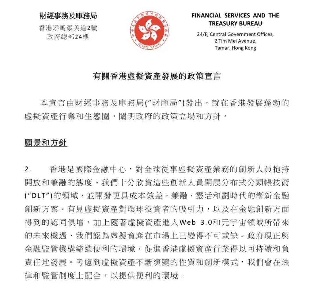 10月31日,香港财政司下属的财经事务及库务局(下文简称"财库局")正式公布《有关香港虚拟资产发展的政策宣言》(下文简称"《宣言》"),引发全球华人Web 3创业者的关注,不少业内人士对剁椒TMT直言: